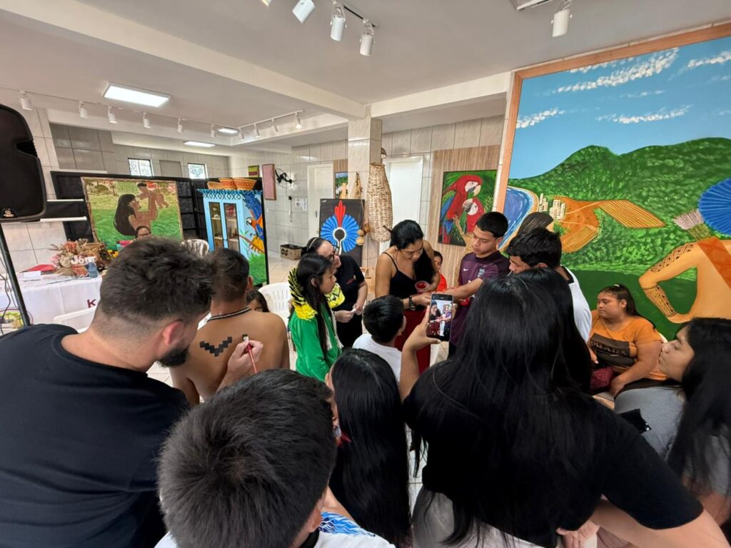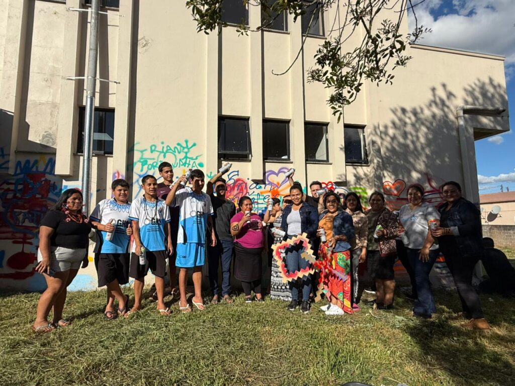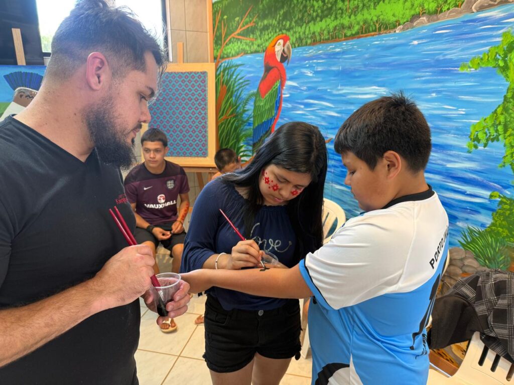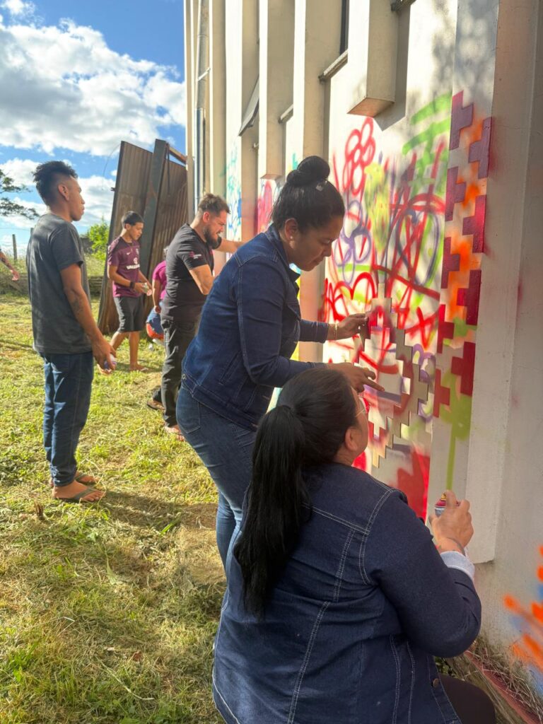 Duas oficinas, a de grafite na perspectiva da arte indígena e pintura corporal facial com grafismos Kaingang estão sendo ministradas por jovens, um deles, o artista Xozão, da Terra Indígena Apucaraninha, no Paraná, e Arian Kãgfér, produtor cultural do Inka, da Terra Indígena Serrinha.